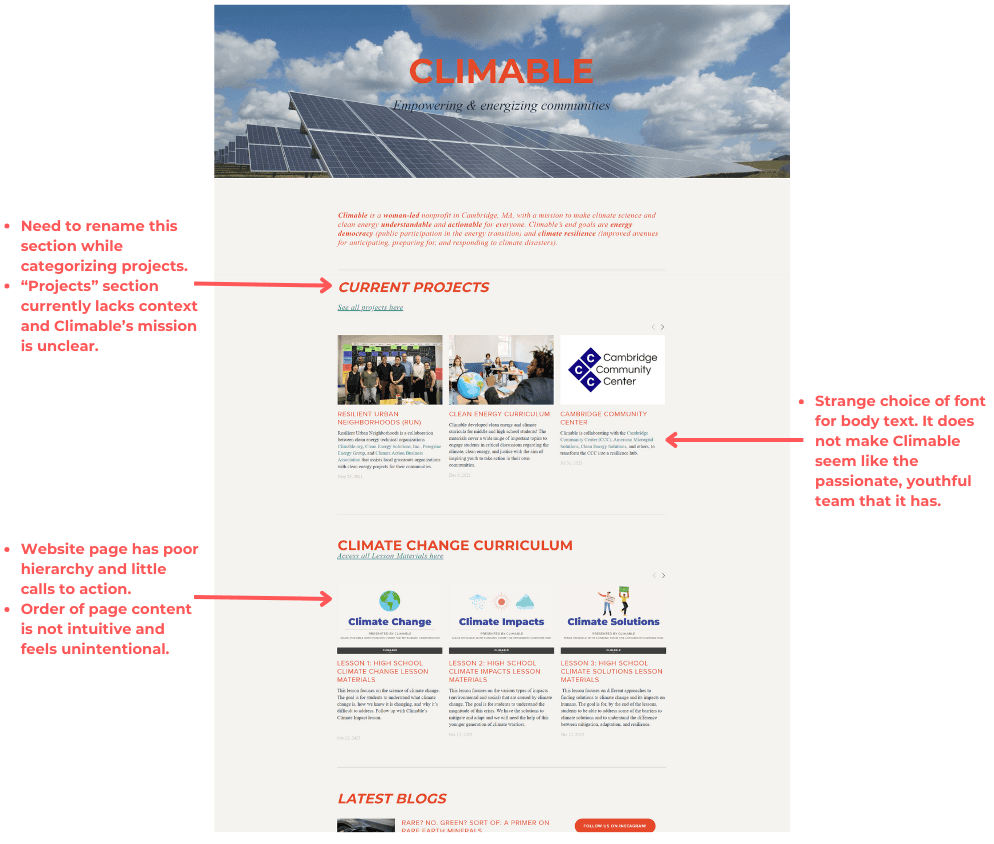 The organization also runs a robust internship program throughout the year to educate more young leaders on the importance of sustainability with a focus on communities, which I was lucky to be a part of in the spring of 2024! Evidently, Climable has a wide range of projects and its staff want to better utilize online platforms and social media to clearly communicate its diverse works. Climable's website is the main way for stakeholders and potential collaborators to find out more about their organization's mission and projects. The website is an integral part of the organization's outreach and online presence, but it had little page hierarchy and was difficult to navigate.
