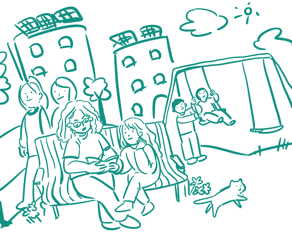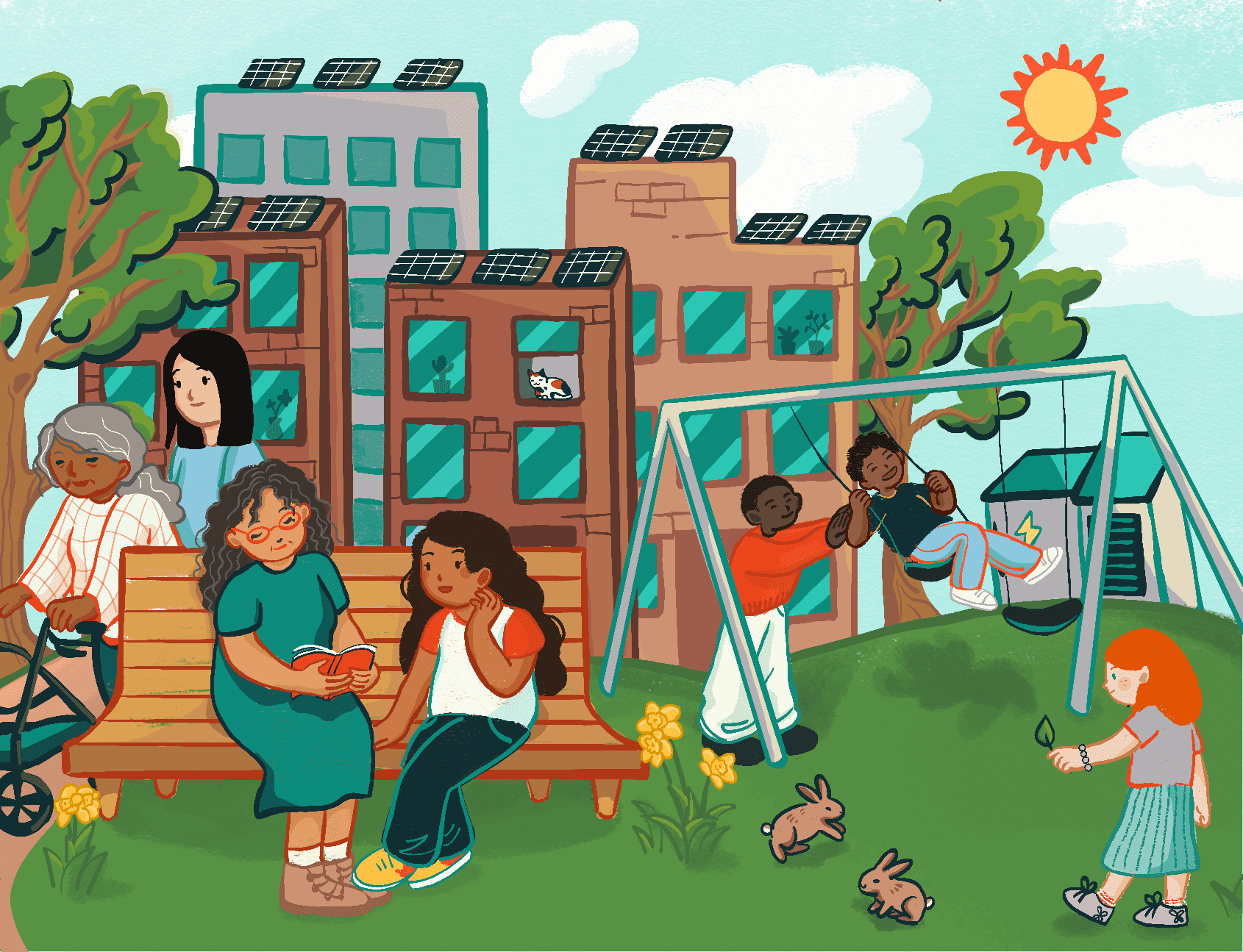 To make this graphic for the "What We Do" section on Climable's website, I discussed with the staff members about their hopes for the environmental justice communities that they work with. The resulting illustration depicts a thriving, warm community full of love, education, space for play, plenty of trees, and clean energy (solar, in this case)!