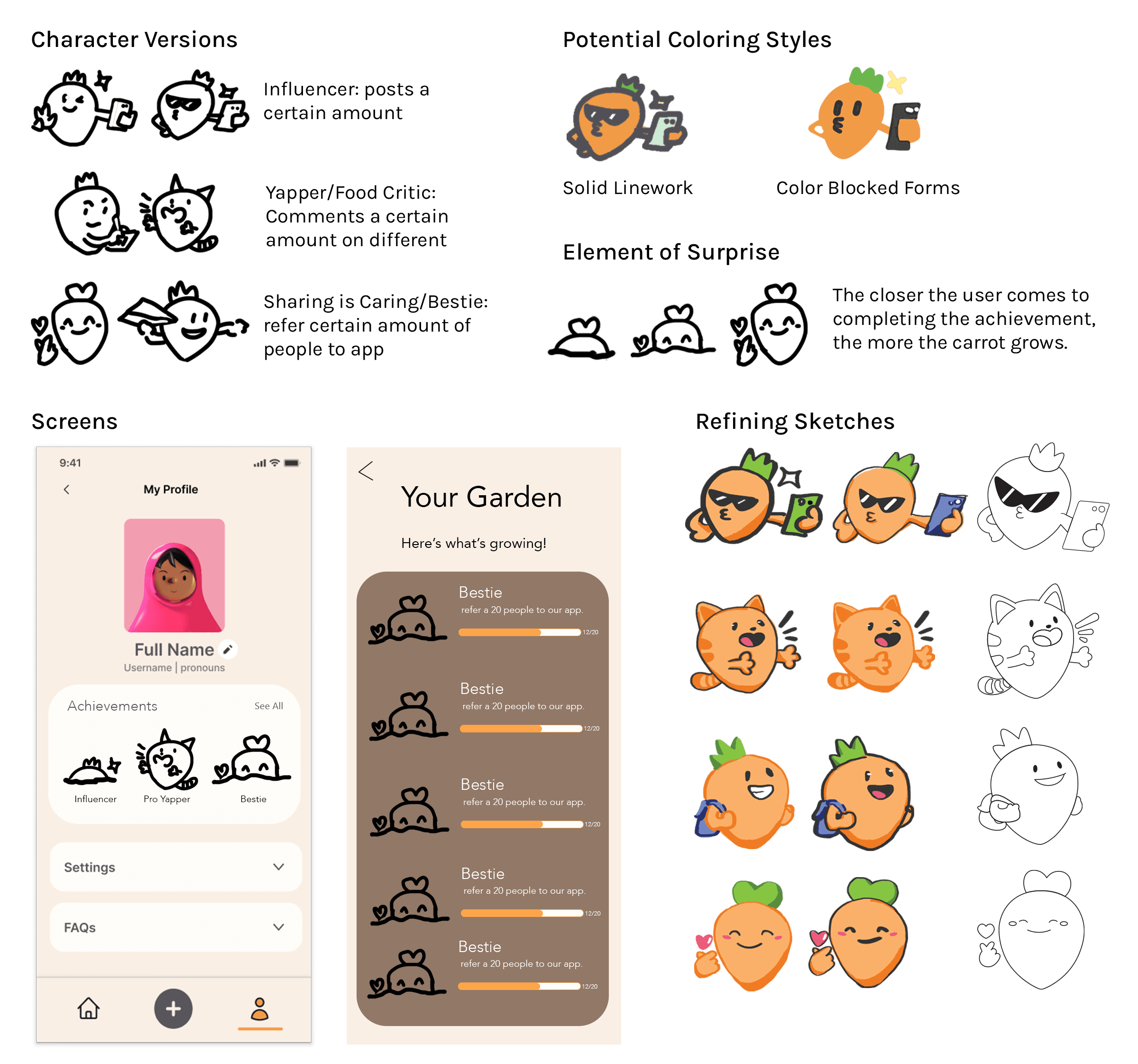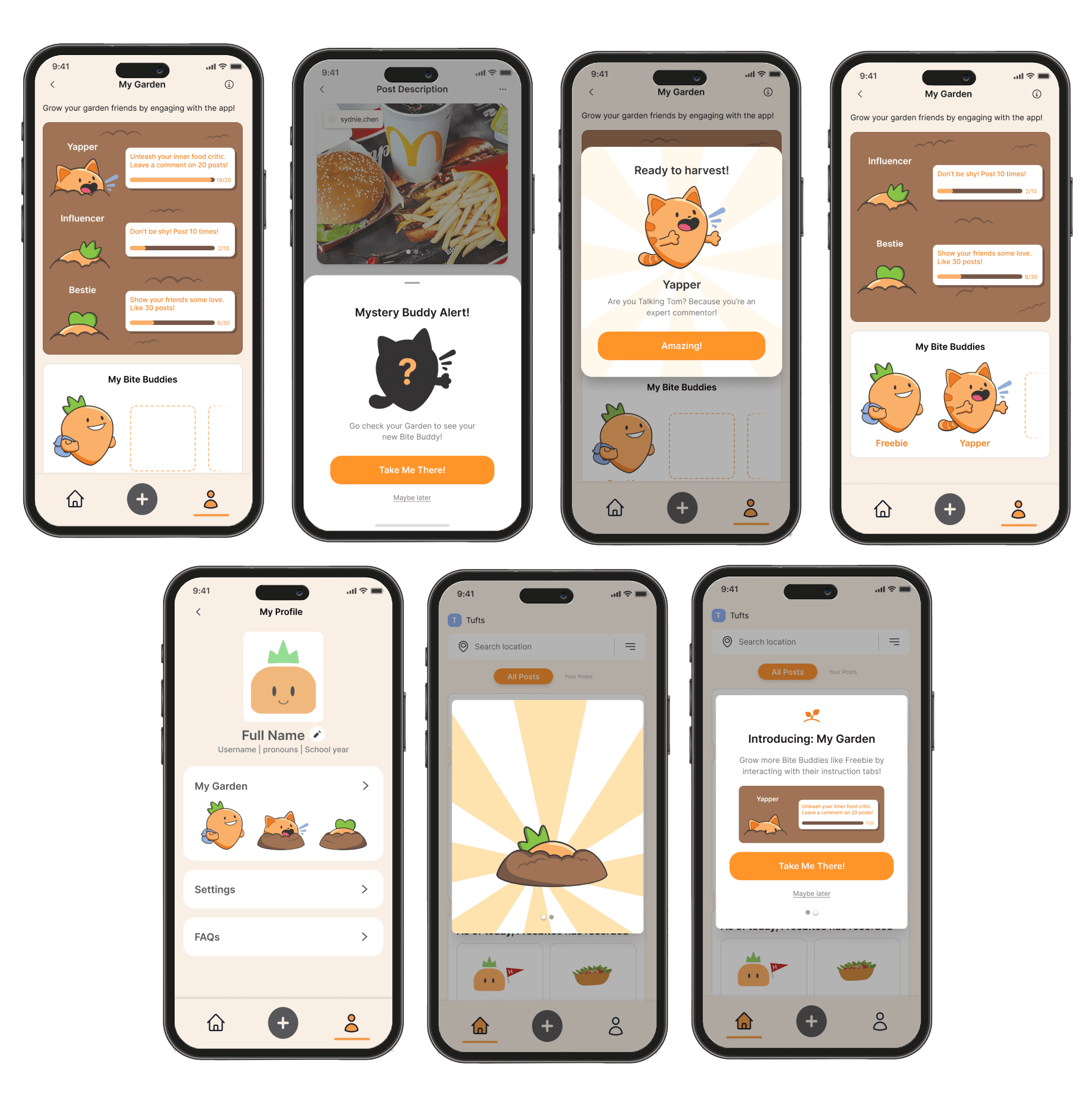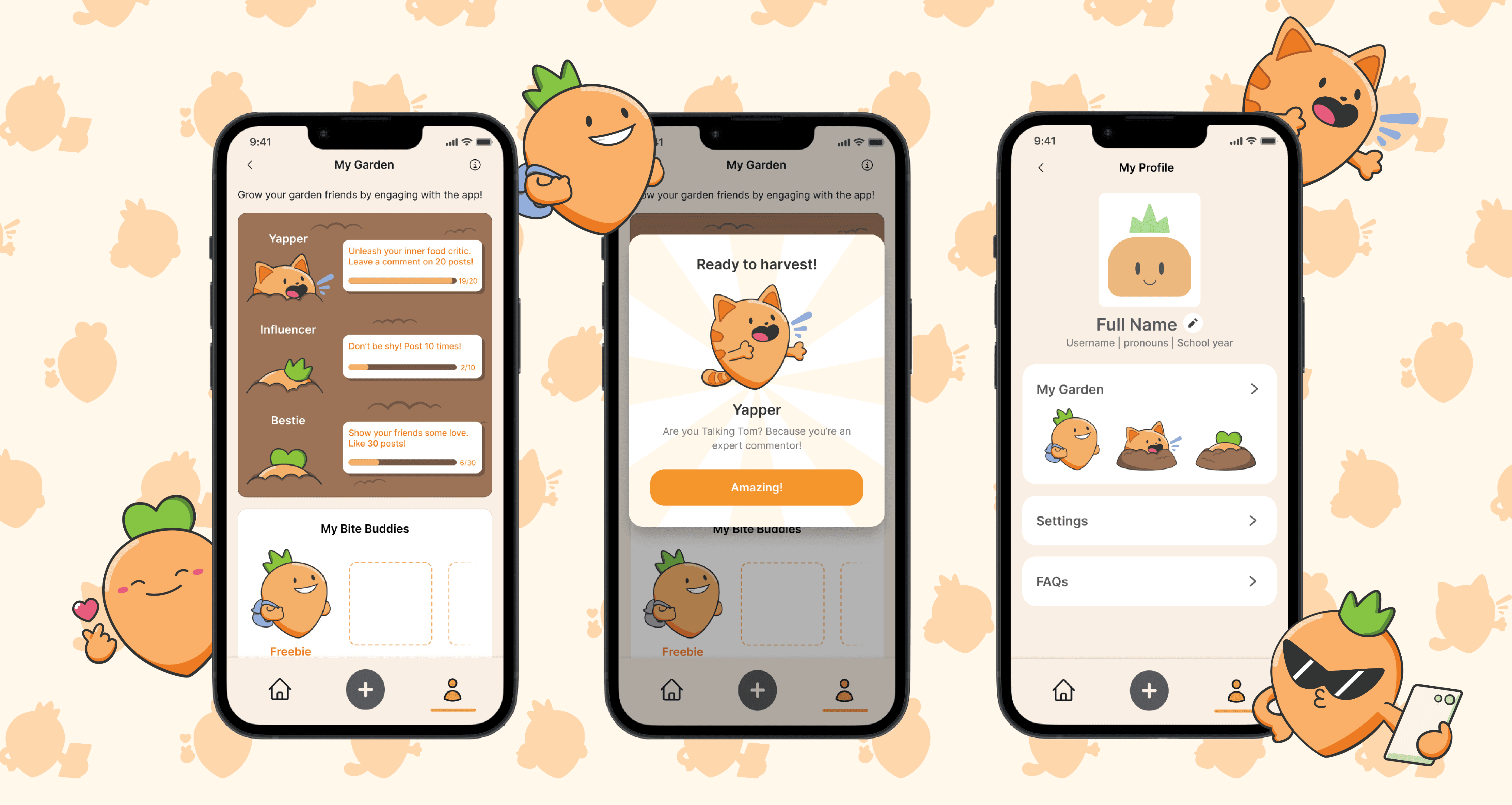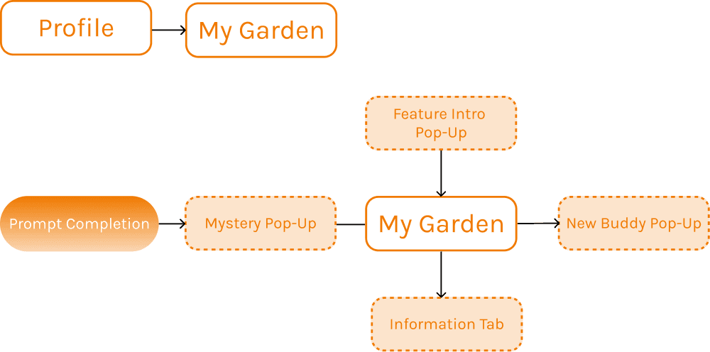 I then moved onto designing the screens. To attract users to engage with the garden, we needed to include a level of transparency and promotional pop-ups to our users. We implemented a garden preview into the profile page including the Garden Buddies in their respective stages of growth. Within the garden page, users can see the question tags and their progress next to the Buddies themselves. Upon achieving the bite buddy, the new bite buddy is revealed on the Bite Buddies board. make a mock-up of the screen.