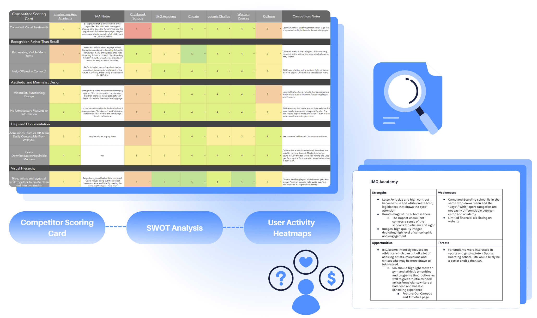 To streamline analysis of Interlochen's 15 competitors and the center's own website, I narrowed down on effective marketing and UX research models and created a scoring rubric. I ended up working with SWOT Analysis in the form of notes as well as a Hubspot-inspired competitor scoring card that also includes a NNGroup Heuristic Evaluation. Additionally, I also utilized data analytics tools to review website heatmaps and user recordings to really get an understanding of Interlochen's users needs and behaviors.