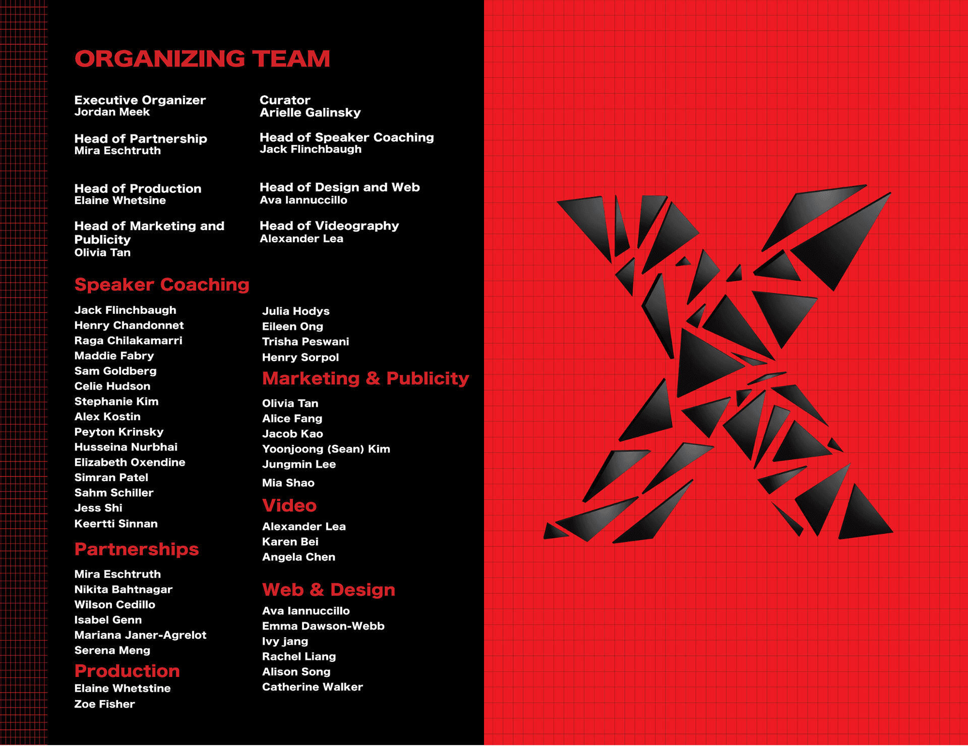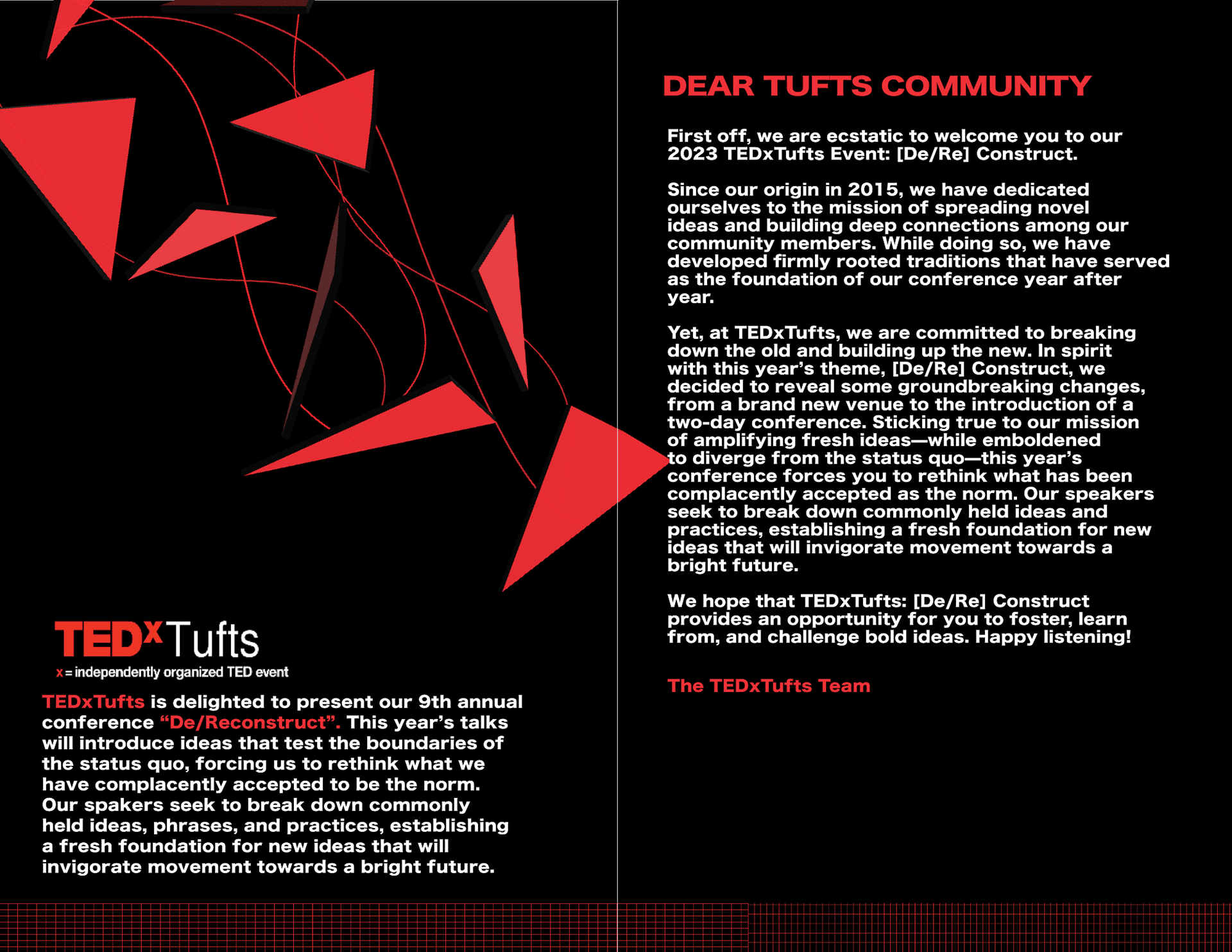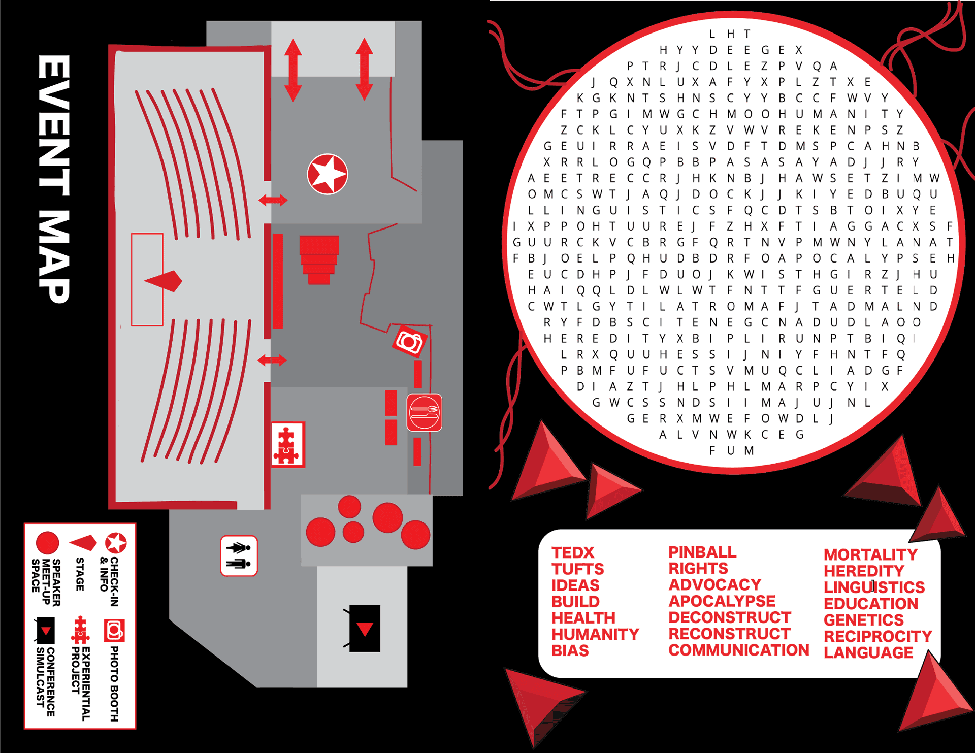 As a member on the Web and Design team in TEDxTufts, I took charge of creating the look and feel of an event program for the annual 2023 spring conference using Adobe Indesign and Illustrator. The "[De/Re]-Construct" logo, event map, and crossword puzzle were created by a fellow designer in TEDxTufts.